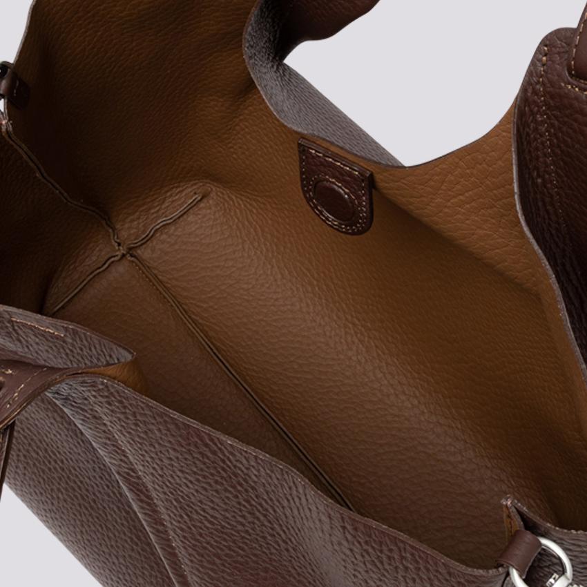 L'iconica Dua realizzata in pelle bubble double testa moro con interno nero. Monoscomparto in pelle sfoderata, completa di pochette interna. Portabilità sotto spalla. Dimensioni: 34x38x16 cm. Designer: Gianni Chiarini